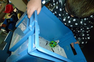 Dans un grand bac en plastique avec une feuille au fond. J'ai tout d'abord mis des splouchs de peinture. C'était un bon début mais ça a beaucoup mieux marché quand on a tartiné la balle de peinture avant de la balancer dans le bac. Ensuite les p'titKo empoignaient le bac à pleines mains et le faisait tourner dans tous les sens. De la peinture sportive en somme!